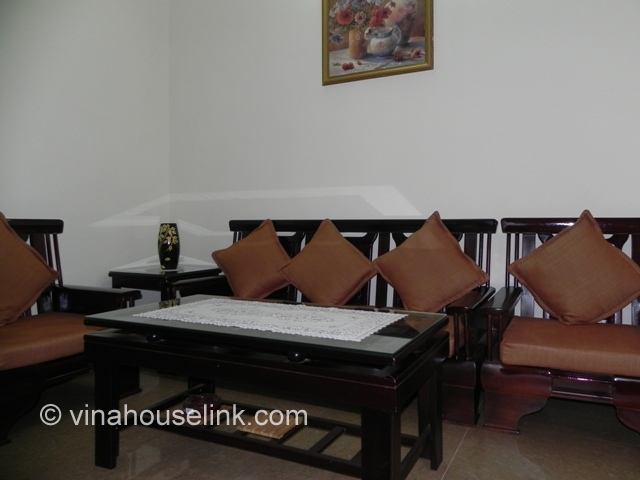 When you enter this apartment for rent in Hanoi, you will see the living room with wooden floor and furnished with luxury furniture such as sofas, coffee table, LCD TV and an air-conditioner.