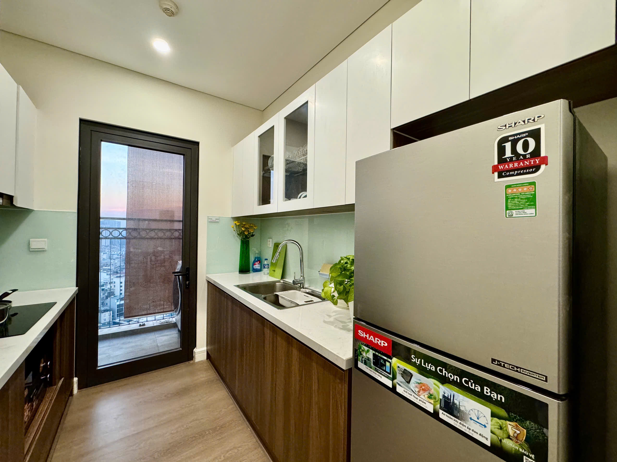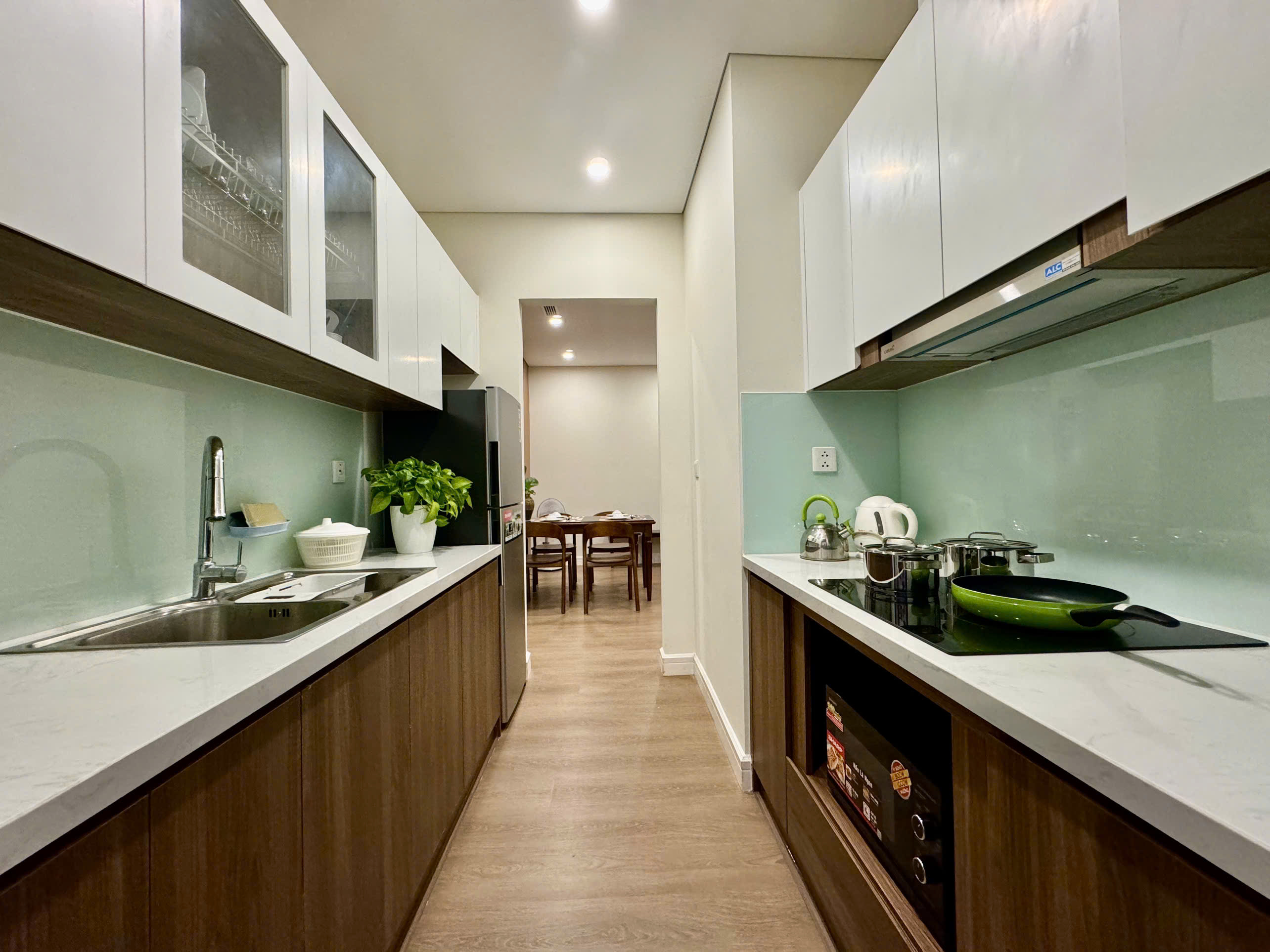 It’s fully equipped with modern appliances: induction stove, hood, refrigerator, microwave, upper and lower cabinets, and cooking utensils.