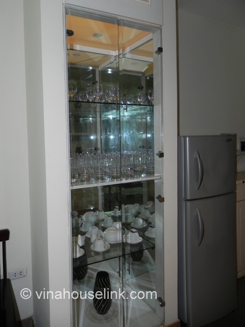 When you enter this apartment for rent in Hanoi, you will see the living room with wooden floor and furnished with luxury furniture such as sofas, coffee table, LCD TV and an air-conditioner.