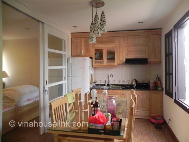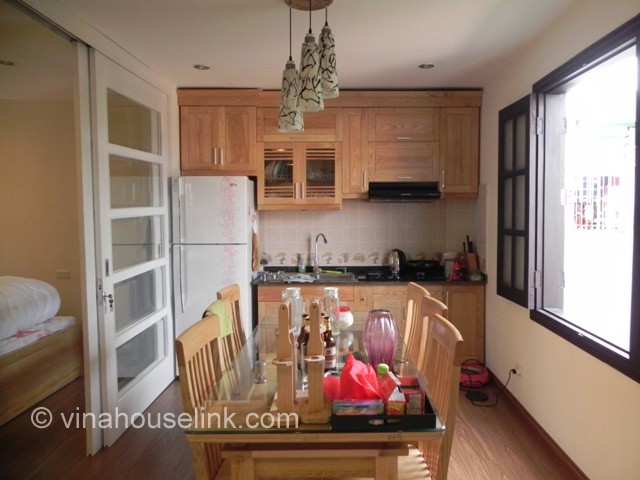 Sharing the same place with the living room is the kitchen, It is designed modernly. It is furnished with all nescessary stuffs for cooking such as a large fridge, cooker hood, gas tank and stove, microwave. And more ideally, It is equipped with a dining table with 6 chairs which would be great place to share your delicious foods with your friends or family.