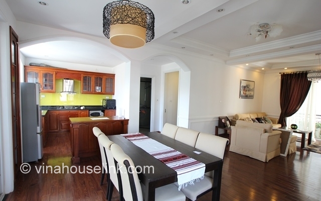 The serviced apartment for rent in HaNoi is fully furnished with nice and high quality furniture. Entering the apartment, you will see the living room. It has a long soft sofa with a tea table in the center of the living room. TV and TV Cabinet are in front of the sofa. There is a nice balcony outsitd the living room. You can view the city from there.