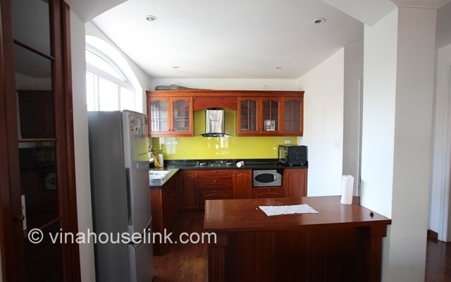 Sharing the same place with the living room is the kitchen, It is designed modernly. It is furnished apartment with all necessary stuffs for cooking such as a large fridge, cooker hood, gas tank and stove, microwave. More ideally, It is equipped with a dining table with 6 nice chairs. The kitchen is very big and beautiful.