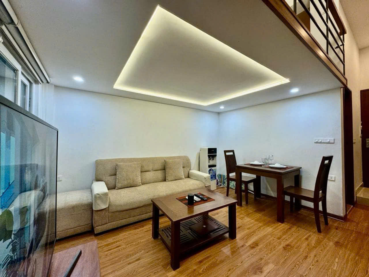 The living room creates a cozy and inviting atmosphere, complete with a stylish sofa and coffee table — the perfect spot to relax or entertain guests. A smart TV with cable ensures endless entertainment, while the elegant hardwood flooring adds warmth and charm. With a handy shelf for storage and a water dispenser for daily convenience, this space is designed for both comfort and modern living.